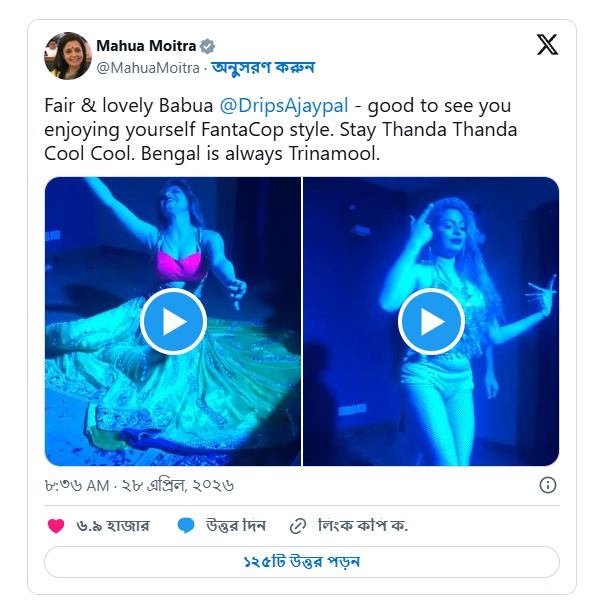 এই ভিডিও প্রকাশ্যে আসার পর শাসকদল তৃণমূল কংগ্রেস বিষয়টি নিয়ে তীব্র প্রতিক্রিয়া জানায়। এরপর আরেকটি ভিডিও সামনে এনে কটাক্ষ করেন তৃণমূল সাংসদ মহুয়া মৈত্র। সেই ভিডিওতে আলো-আঁধারিতে এক নারীর সঙ্গে নাচগানে মেতে থাকতে দেখা যাচ্ছে ওই পুলিশ আধিকারিককে। ভিডিওটি পোস্ট করে মহুয়া মৈত্র কটাক্ষের সুরে তাঁকে ‘ফেয়ার অ্যান্ড লাভলি বাবুয়া’ বলে উল্লেখ করেন এবং লেখেন, তিনি যেন “ঠান্ডা ঠান্ডা কুল কুল” থাকেন এবং মনে রাখেন—বাংলায় সবসময় তৃণমূল।