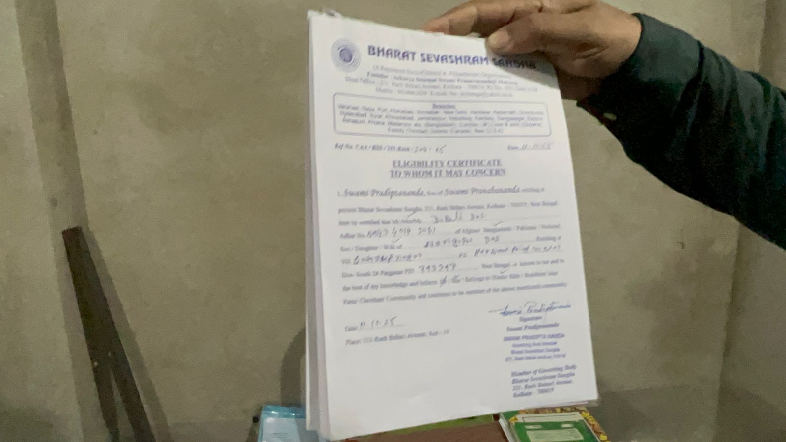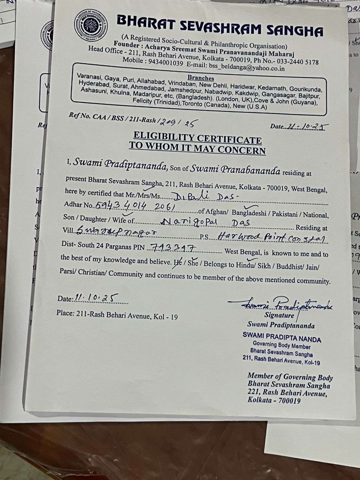 বাসন্তী ময়দানের ওই অফিসে গিয়ে দেখা যায়, ঘরের সামনে বিজেপি নেতা দীপঙ্কর জানার ছবি টাঙানো। ভিতরে এক মহিলা কম্পিউটারে বসে প্রতি জনের কাছ থেকে ৬০ টাকা নিচ্ছেন অনলাইনে CAA ফর্ম পূরণের জন্য। পাশের ঘরে আরেকজন মহিলা ভারত সেবা সংঘের প্যাডে কাগজপত্র তৈরি করে দিচ্ছেন বাংলাদেশ থেকে আসা আবেদনকারীদের। সেখানে ভারত সেবাশ্রম সংঘের রাবার স্ট্যাম্পও দেখা গেছে।