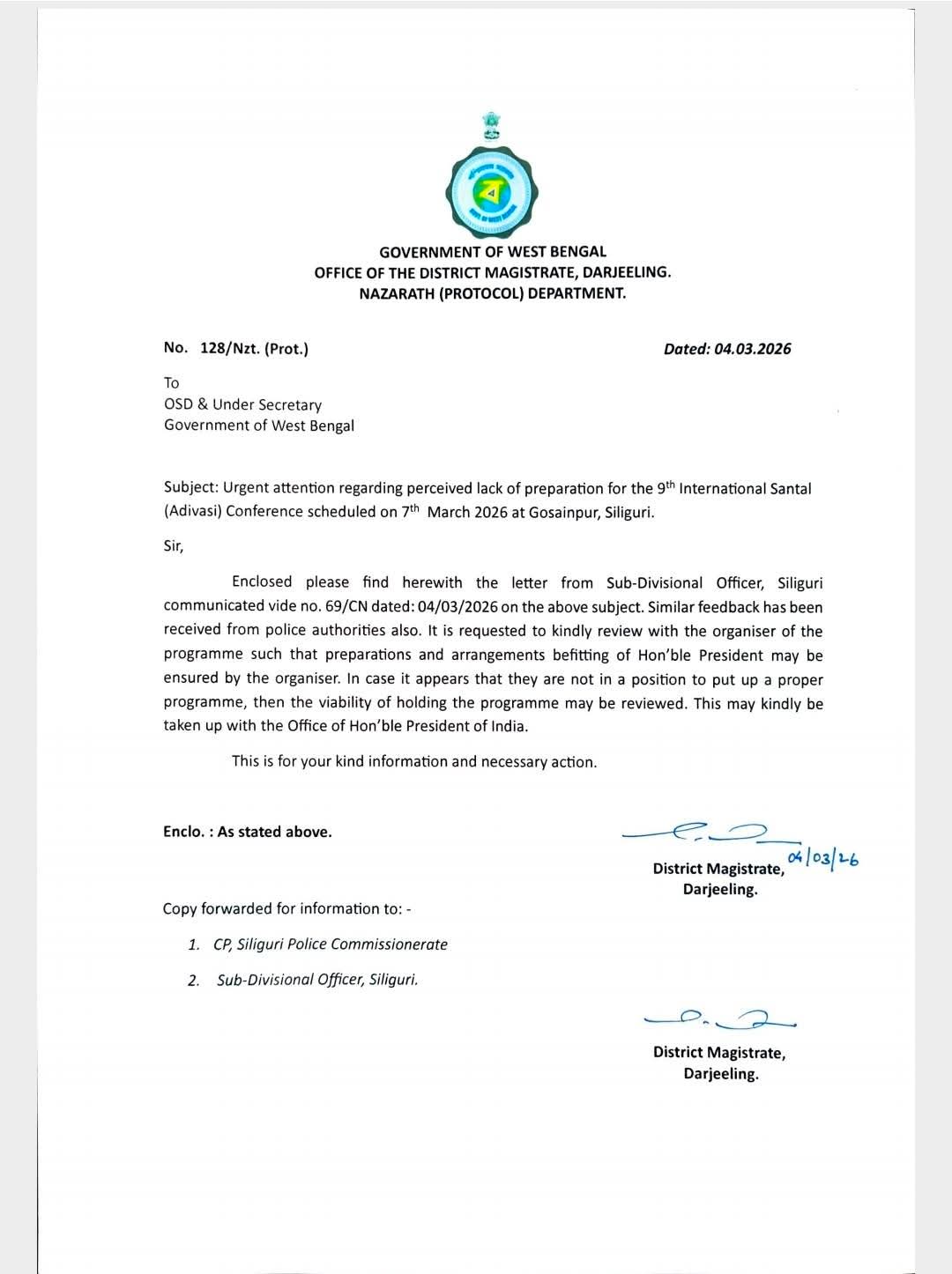 মুখ্যমন্ত্রী জানান, একটি বেসরকারি সংগঠন ইন্টারন্যাশনাল সাঁওতাল কাউন্সিল শিলিগুড়িতে নবম আন্তর্জাতিক আদিবাসী সাঁওতাল সম্মেলনে যোগ দেওয়ার জন্য দেশের রাষ্ট্রপতিকে আমন্ত্রণ জানায়। প্রশাসনের তরফে আগাম নিরাপত্তা বৈঠকের সময়ই দার্জিলিং জেলার প্রশাসন রাষ্ট্রপতির সচিবালয়কে লিখিতভাবে জানায় যে আয়োজকদের প্রস্তুতি যথেষ্ট নয়। এমনকি বিষয়টি টেলিফোনেও জানানো হয়েছিল বলেও দাবি করেছেন মুখ্যমন্ত্রী।