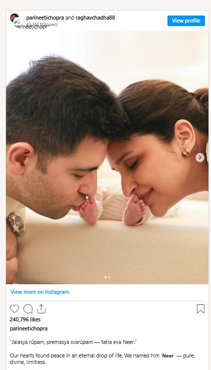 পরিণীতি চোপড়া ও রাঘব চাড্ডা তাঁদের নবজাতক পুত্রের নাম অবশেষে জানালেন এক আদুরে ভঙ্গিতে। জন্মের পর থেকেই বলিউডভক্তদের কৌতূহল ছিল তারকা দম্পতির ছেলের নাম কী হতে পারে। সেই জল্পনার অবসান ঘটিয়ে পরিণীতি–রাঘব সোশ্যাল মিডিয়ায় শেয়ার করলেন একটি মিষ্টি পোস্ট। সেখানেই তাঁরা জানান তাঁদের ছেলের নাম।