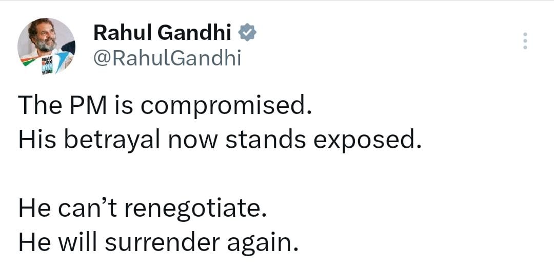 কেন্দ্রের বিরুদ্ধে আক্রমণের ঝাঁজ আরও বাড়ালেন কংগ্রেস নেতা Rahul Gandhi। নিজের এক্স হ্যান্ডেলে করা একটি সংক্ষিপ্ত কিন্তু তীব্র পোস্ট ঘিরে ইতিমধ্যেই রাজনৈতিক মহলে চর্চা শুরু হয়েছে। সেখানে তিনি সরাসরি প্রধানমন্ত্রীকে নিশানা করে লেখেন, “The PM is compromised. His betrayal now stands exposed. He can’t renegotiate. He will surrender again.” অর্থাৎ, প্রধানমন্ত্রীর বিরুদ্ধে আপস এবং বিশ্বাসঘাতকতার অভিযোগ তুলেই তিনি দাবি করেছেন, পরিস্থিতি পুনর্বিবেচনার আর কোনও সুযোগ নেই এবং শেষ পর্যন্ত আবারও আত্মসমর্পণই করতে হবে।