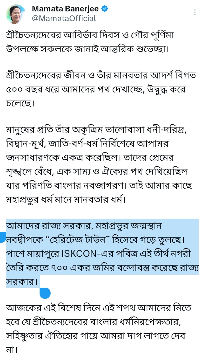 নিজস্ব সংবাদদাতা: এবারের বিধানসভা ভোটে ভরকেন্দ্র ভবানীপুর। ভোট শুরু না হলেও ভবানীপুর নিয়ে টক্কর চলছে, শুভেন্দু বনাম মমতার। আরে শুভেন্দু অধিকারী চ্যালেঞ্জ ছুড়েছেন, এস আই আর এ নাম্বার যাওয়ার পরে মমতা বন্দ্যোপাধ্যায়কে ভবানীপুরে জেতানোর মতো ভোটার বেঁচে থাকবে না। পাল্টা মমতা বন্দ্যোপাধ্যায় জানিয়ে দিয়েছেন, এক ভোটে হলেও তিনিই জিতবেন ভবানীপুরে। এরই মাঝে মঙ্গলবার দোল উৎসবে লেগে গেল রাজনীতির রং। এদিনই ছিল শ্রীচৈতন্যদেবের আবির্ভাব দিবস। এক্সে পোস্ট করে মমতা বন্দ্যোপাধ্যায় লেখেন, “আজকের এই বিশেষ দিনে এই শপথ আমাদের নিতে হবে যে শ্রীচৈতন্যদেবের বাংলার ধর্মনিরপেক্ষতার, সহিষ্ণুতার ঐতিহ্যের গায়ে আমরা দাগ লাগতে দেব না।”